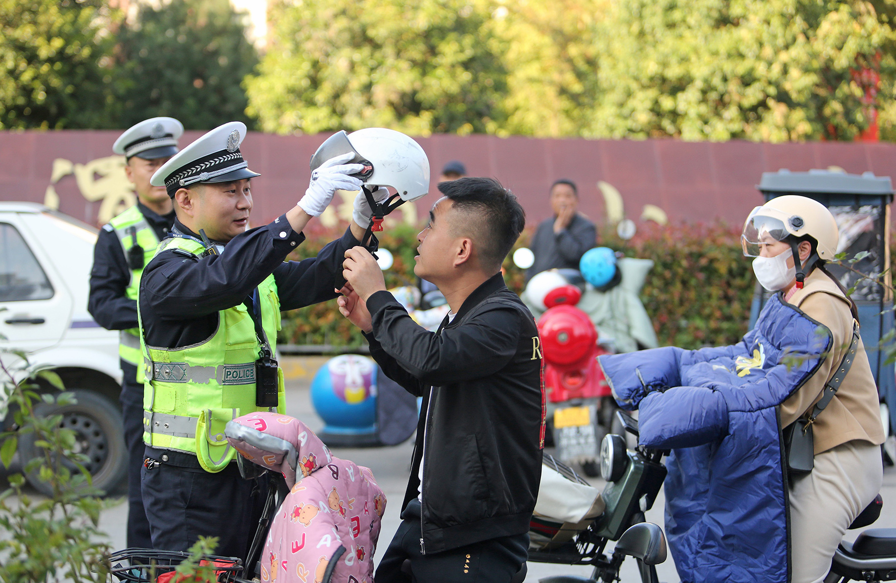 10月20日,陜西省渭南市區(qū)樂天大街中段,民警提醒市民佩戴好安全頭盔。連日來,陜西省渭南市公安局交警支隊(duì)組織中心城區(qū)開展“一盔一帶”專項(xiàng)整治行動(dòng)。民警采取“勸導(dǎo)+教育”的方式,對駕乘電動(dòng)自行車未佩戴安全頭盔群眾進(jìn)行查糾、勸導(dǎo),不斷提升市民安全出行意識(shí)。
