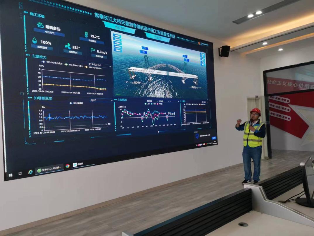 數(shù)字孿生系統(tǒng),不僅方便了解施工現(xiàn)狀,而且能進行仿真推演,優(yōu)化施工方案。在天星洲專用航道橋施工過程中,利用數(shù)字孿生技術(shù),搭建云端無線采集系統(tǒng),全方位實時獲取橋梁施工相關(guān)數(shù)據(jù)。讓數(shù)據(jù)“在電腦上多跑路”,對施工控制數(shù)據(jù)進行實時分析,實時預(yù)警,確保結(jié)構(gòu)施工過程始終處于可控狀態(tài);以不同顏色區(qū)分當前桿件安裝狀態(tài),實現(xiàn)工序級別的形象進度展示及基于工序的質(zhì)量驗收;而且平臺內(nèi)可以對施工工序模擬,保障現(xiàn)場構(gòu)件保供安排,確保施工質(zhì)量、物資調(diào)度、進度安排合理可控……