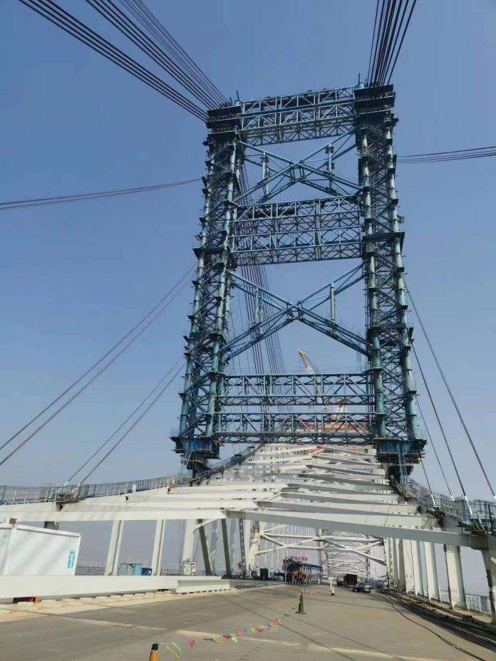 登上懸于江面60米的大橋在建主航道橋面,一排排“N”形鋼桁梁呈現(xiàn)在記者眼前。據(jù)介紹,鋼桁梁制造完成后將運至橋位處整體吊裝,吊裝時需要將鋼桁梁平穩(wěn)提升到江面以上60米,最大吊裝重量超過1700噸。為滿足橋梁建設(shè)模塊大型化發(fā)展的新需求,項目團隊研制了2000噸級全球最大噸位橋面吊機,用于主航道橋鋼桁梁架設(shè)?!霸摰鯔C集成了可視化吊裝系統(tǒng)、智能調(diào)位及快速定位系統(tǒng)、自動倒換軌道及行走控制系統(tǒng)、輔助掛索等功能于一體,是橋面吊機制造史上一次重要突破?!蓖踺x介紹說,該吊機最大起重量為2000噸,最大起升高度80米,吊幅為13到23米之間,相當于能一次性將1400臺小汽車吊至25層樓的高度。