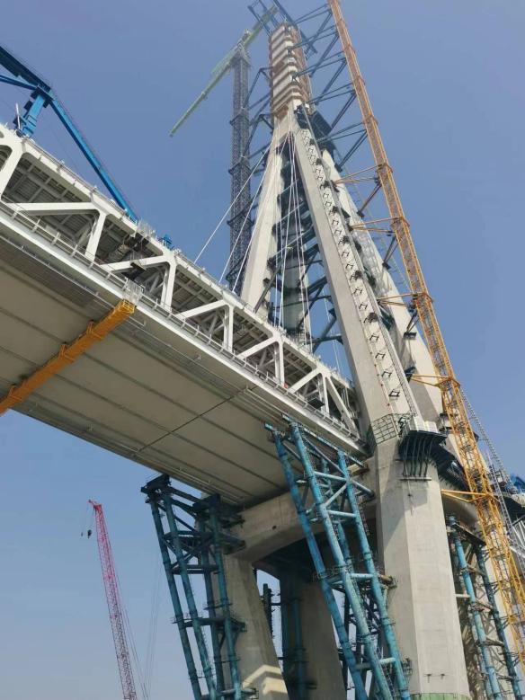 在位于江心的施工現(xiàn)場,記者看到,一臺比主塔還高的“綠巨人”在空中“忙碌”,它是項目團隊自主研發(fā)的全球首臺萬噸米級智能化塔吊。巨大的身軀卻有著靈活的“大腦”,集成了主動防碰撞、鋼絲繩磨損檢測、監(jiān)測與預(yù)警系統(tǒng)和變頻回轉(zhuǎn)技術(shù)等,并應(yīng)用北斗定位技術(shù),實現(xiàn)鋼塔節(jié)段吊裝對接過程智能指引,確保吊裝過程安全高效。據(jù)王輝介紹,大橋主塔是整個橋梁的核心工程,其中最搶眼的中、下塔柱首創(chuàng)采用了空間鉆石型混凝土索塔,施工過程中,項目團隊自主研發(fā)了鋼筋部品裝配化施工技術(shù),研發(fā)使用新型液壓智能爬模等等,大幅減少塔上鋼筋作業(yè)時間,顯著提高了塔柱施工效率。相對于傳統(tǒng)索塔施工工藝,節(jié)省工期70%,高空作業(yè)人員減少60%。