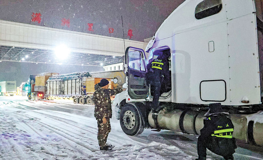 12月7日晚,內蒙古自治區(qū)滿洲里市遭遇強降雪天氣,氣溫降至零下30攝氏度,滿洲里出入境邊防檢查站迅速啟動應急預案,加強口岸管控力度,強化重點區(qū)域巡查,確??诎锻P安全有序。(李發(fā)春)