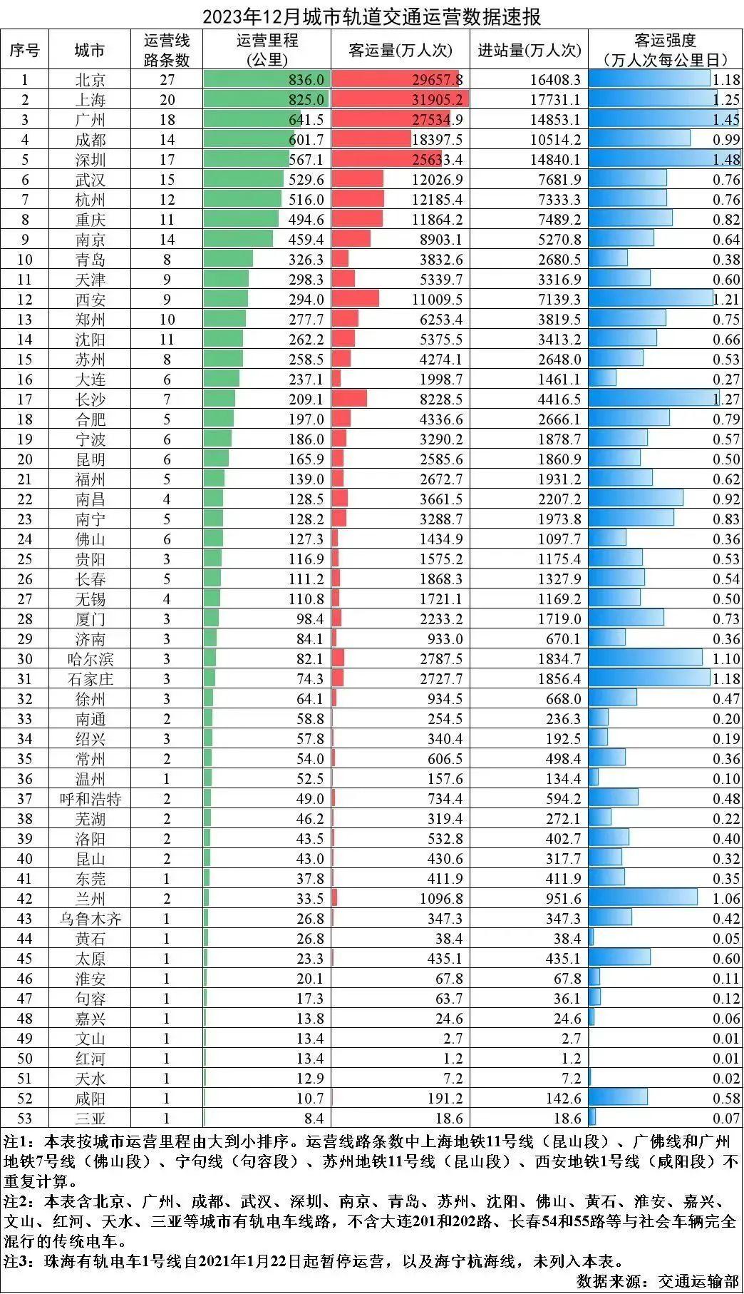 2023年12月,31個(gè)省(自治區(qū)、直轄市)和新疆生產(chǎn)建設(shè)兵團(tuán)共有55個(gè)城市開(kāi)通運(yùn)營(yíng)城市軌道交通線路306條,運(yùn)營(yíng)里程10165.7公里,實(shí)際開(kāi)行列車333萬(wàn)列次,完成客運(yùn)量26.7億人次,進(jìn)站量16億人次。12月份,客運(yùn)量環(huán)比增加0.8億人次,增長(zhǎng)3.2%,同比增加15.1億人次,增長(zhǎng)130.1%,較2019年月均客運(yùn)量增加6.8億人次,增長(zhǎng)34%。12月份全國(guó)總運(yùn)營(yíng)里程的平均客運(yùn)強(qiáng)度為0.863萬(wàn)人次每公里日,較2019年全國(guó)總運(yùn)營(yíng)里程的平均客運(yùn)強(qiáng)度降低18.6%。