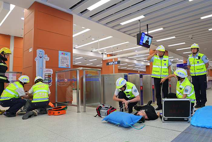 演練現(xiàn)場,模擬末端列車駕駛員室因電氣設(shè)備短路引發(fā)火情,使得列車迫停于區(qū)間,大量乘客受困于車廂內(nèi),同時因無法動車影響其他列車運(yùn)行,導(dǎo)致學(xué)苑北路站客流積壓的事件場景。演練過程組織嚴(yán)密、緊張有序,火災(zāi)警報觸發(fā)后,地鐵運(yùn)營工作人員快速到達(dá)受困車廂安撫“乘客”并就近實施疏散,在引導(dǎo)“乘客”逃生的同時時刻關(guān)注“乘客”身體狀況,及時開展救助救援和急救措施。車站內(nèi)軌道運(yùn)營企業(yè)先期處置、區(qū)級應(yīng)急力量參與、市指揮部指揮跨區(qū)應(yīng)急聯(lián)動,車站外市消防救援總隊、市衛(wèi)健委等市指揮部成員單位和區(qū)指揮部成員單位之間協(xié)同配合聯(lián)動處置,各級預(yù)案逐步啟動,各單位、部門及時響應(yīng),對預(yù)設(shè)場景應(yīng)急處置快速得當(dāng)。