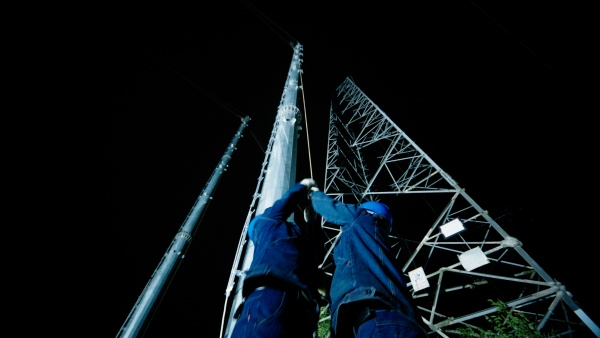 10月21日凌晨4時10分,在新建的河南省平頂山至漯河、周口高速鐵路電力線路遷改工程220千伏Ⅱ英普線停電施工現(xiàn)場,漯河市供電公司作業(yè)人員正在進行跨越京廣高鐵導線展放工作。