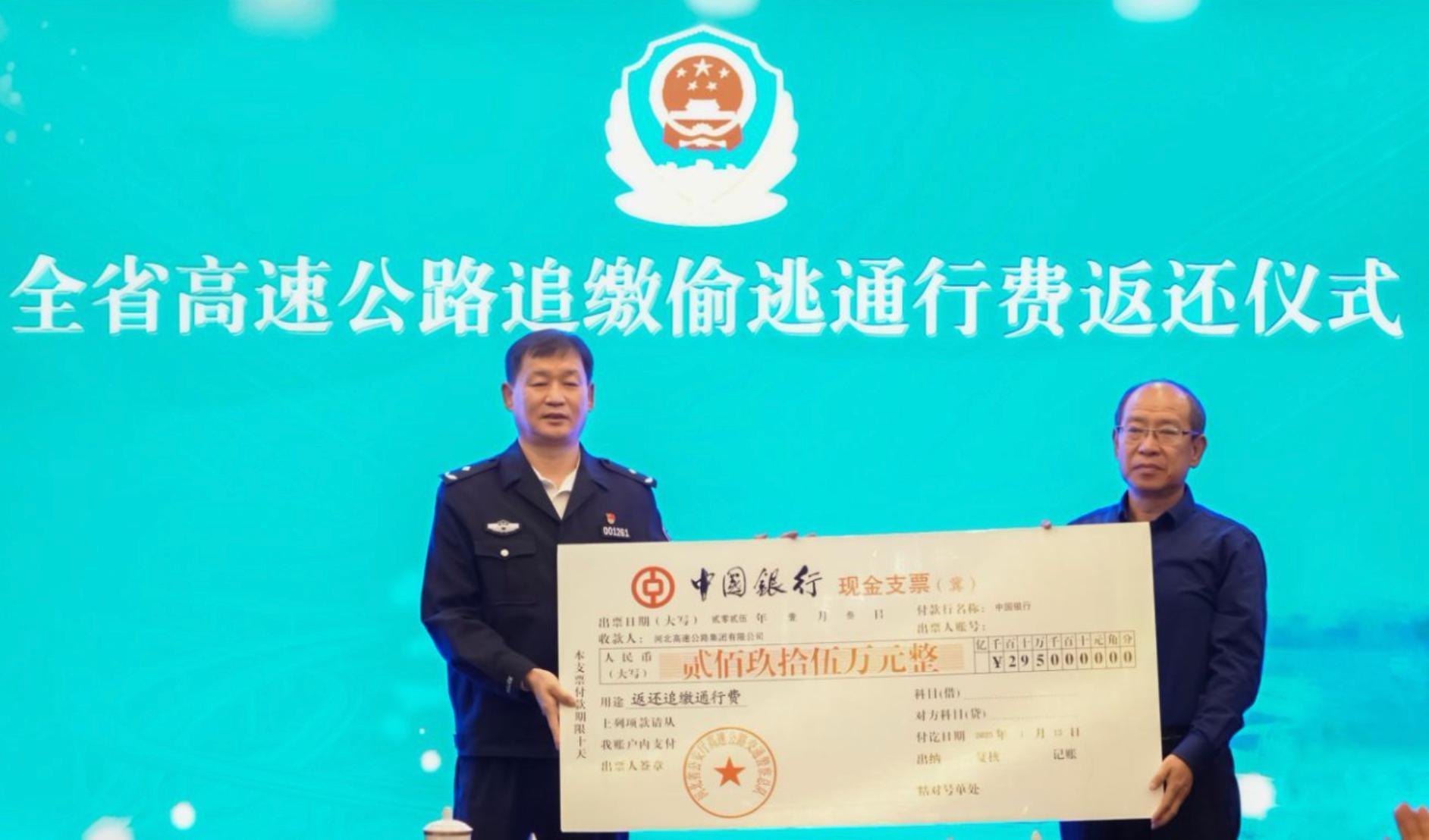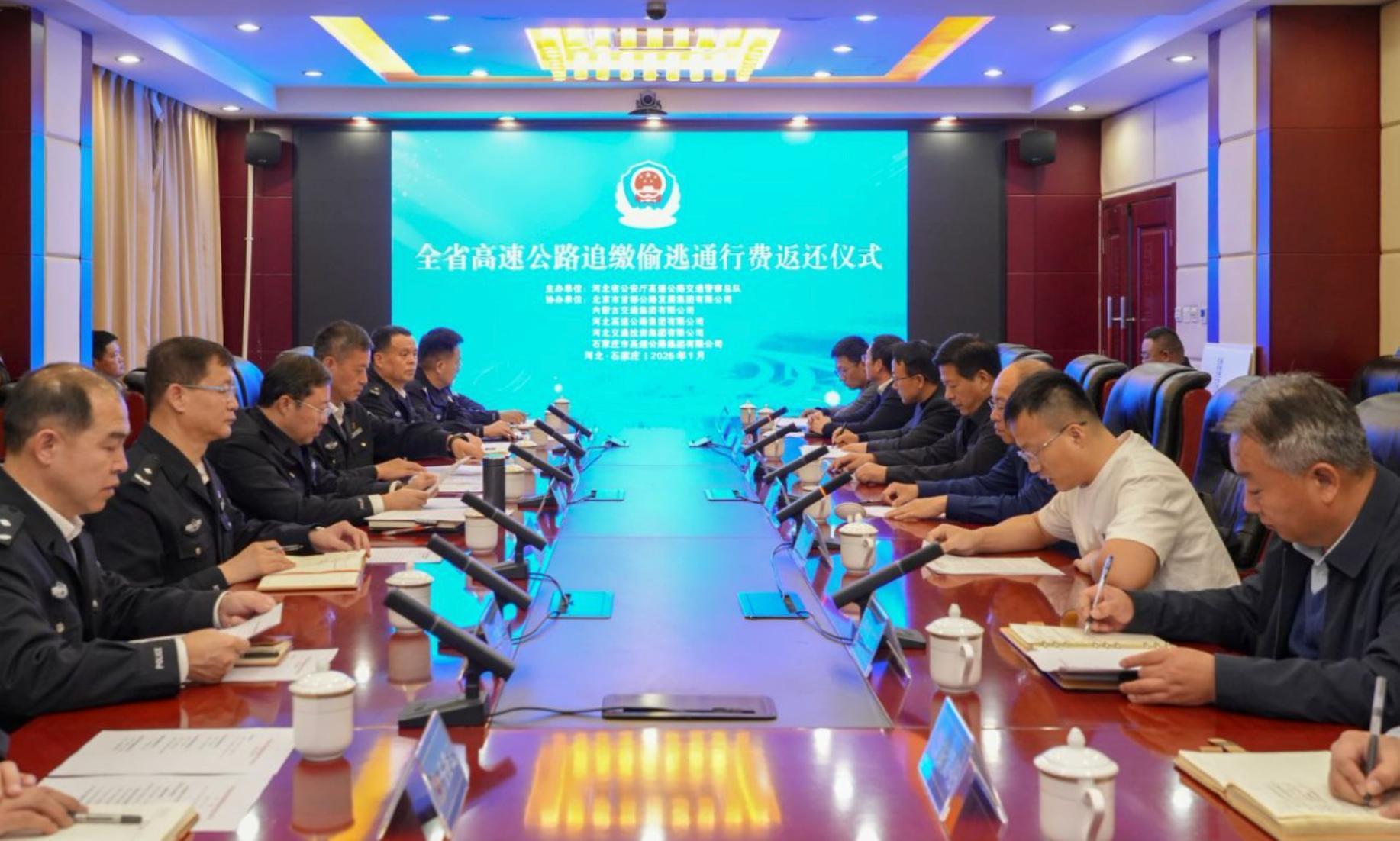 為集中展示高速交警依法刑事打擊涉交類違法犯罪專項行動成效,1月3日,河北省高速交警總隊舉辦全省高速公路追繳偷逃通行費返還儀式,向河北高速集團(tuán)、河北交投集團(tuán)、北京首發(fā)集團(tuán)、內(nèi)蒙古交通集團(tuán)、石家莊市高速集團(tuán)5家業(yè)主單位返還追繳偷逃通行費550萬元。