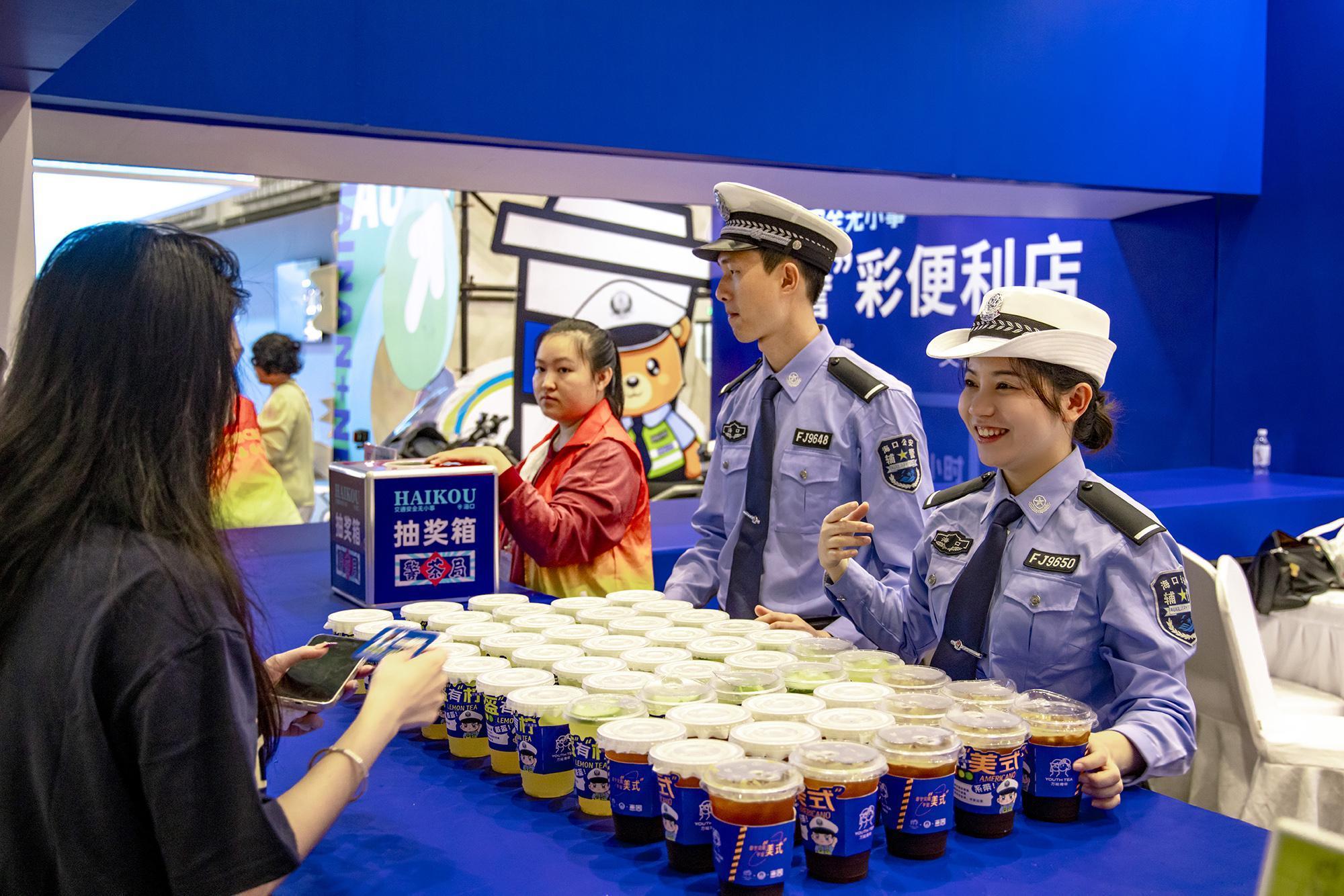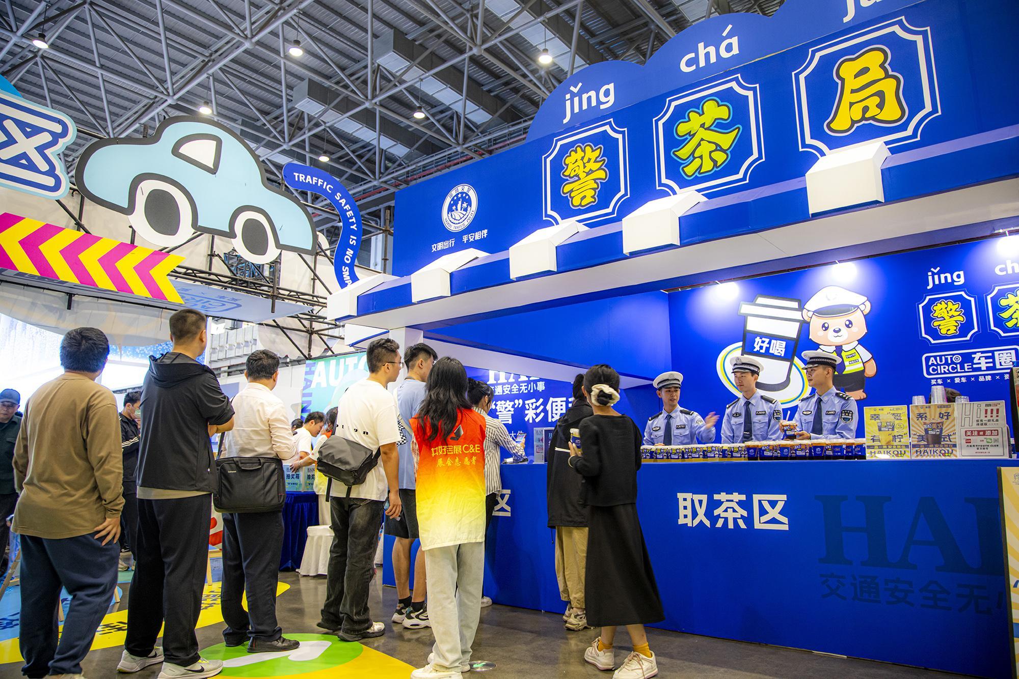 走進1號展館,“警茶局”創(chuàng)意攤位前排起長龍。市民掃描二維碼參與“交通安全快測”答題,答對6題即可兌換限量特調飲品——清新檸檬茶“幸盔有檸”杯身印有醒目戴頭盔安全提示,咖啡特調“系好美式”以安全帶印制“系好安全帶,平安出發(fā)”標語,巧妙融合普法知識點。交警化身“茶飲師”為市民送上安全特調飲品,貼心叮囑出行安全事項,警民互動其樂融融。