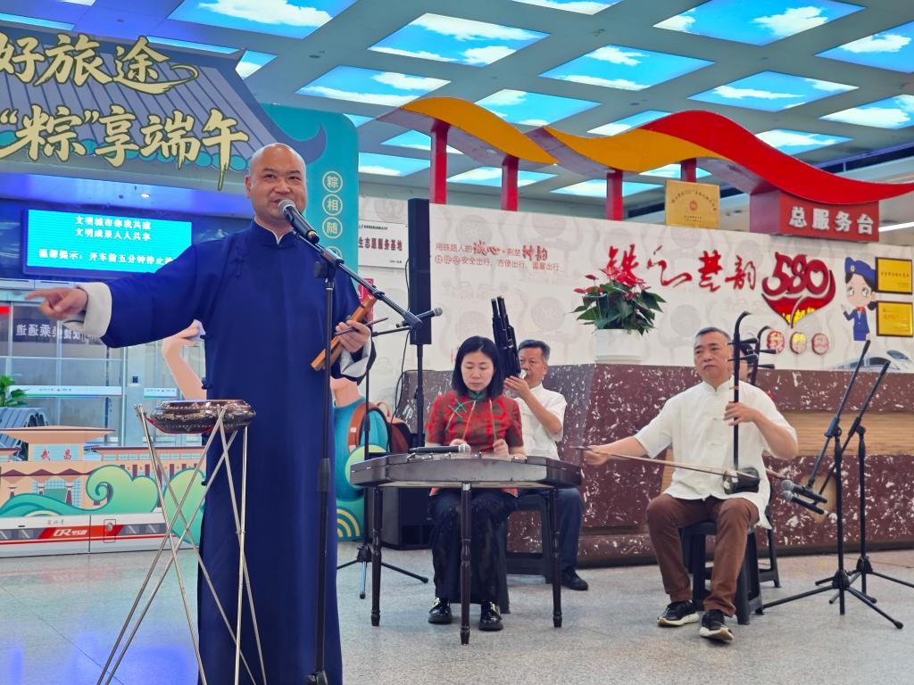 圖為在湖北武昌站演出的湖北大鼓《有意思》。(國(guó)鐵武漢局集團(tuán)公司供圖)