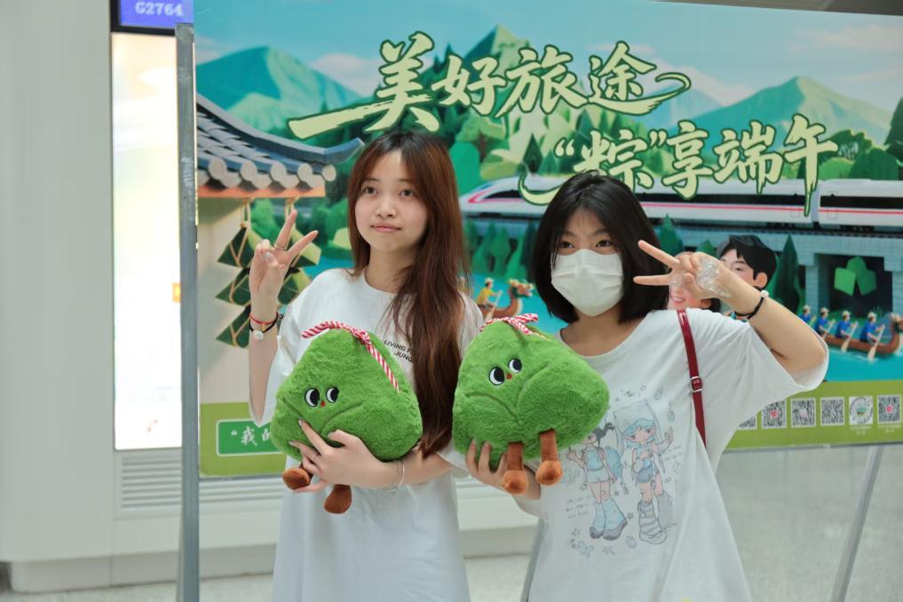 圖為贛州西站候車旅客在“美好旅途 ‘粽’享端午”背景板前打卡拍照。(國(guó)鐵南昌局集團(tuán)公司供圖)