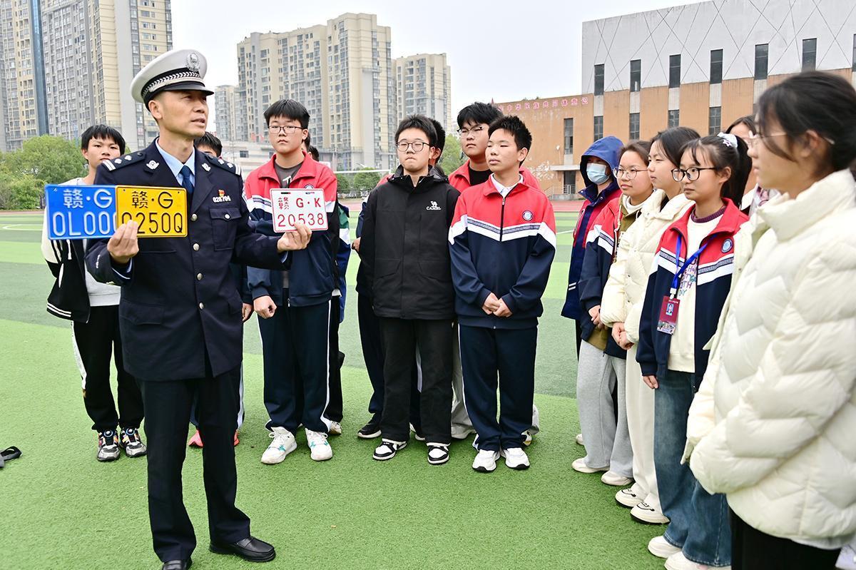圖為民警向?qū)W生介紹電動(dòng)自行車、二輪摩托車(含電動(dòng)摩托車)三種不同顏色牌照的區(qū)別。