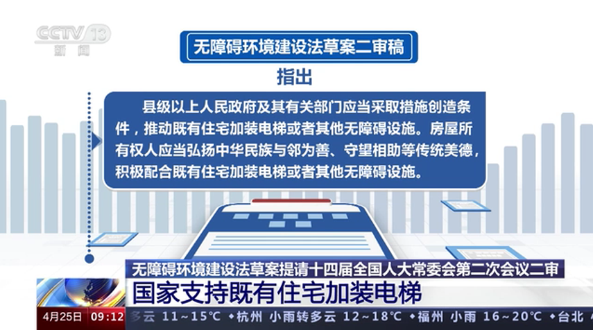 無障礙環(huán)境建設法草案提請十四屆全國人大常委會第二次會議二審 國家支持既有住宅加裝電梯