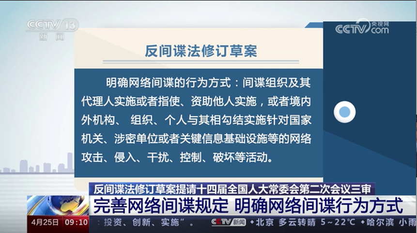 反間諜法修訂草案提請十四屆全國人大常委會第二次會議三審 完善網(wǎng)絡間諜規(guī)定 明確網(wǎng)絡間諜行為方式