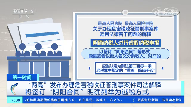 “兩高”發(fā)布辦理危害稅收征管刑事案件司法解釋 將簽訂“陰陽合同”明確列舉為逃稅方式