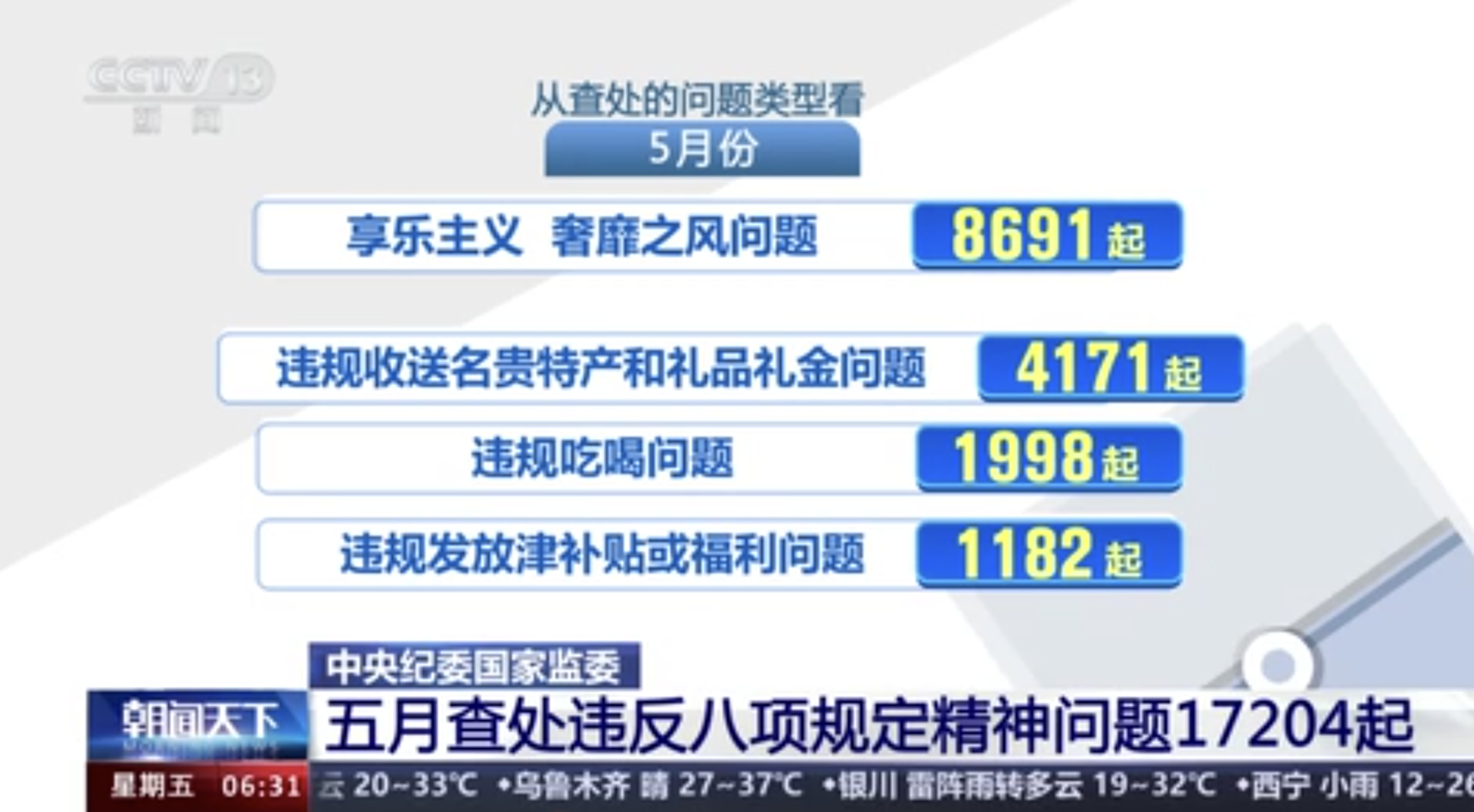 中央紀(jì)委國(guó)家監(jiān)委 五月查處違反八項(xiàng)規(guī)定精神問題17204起