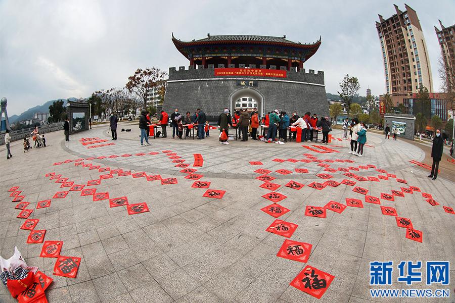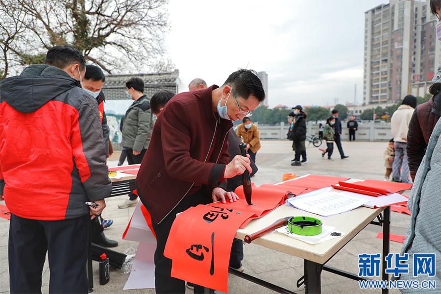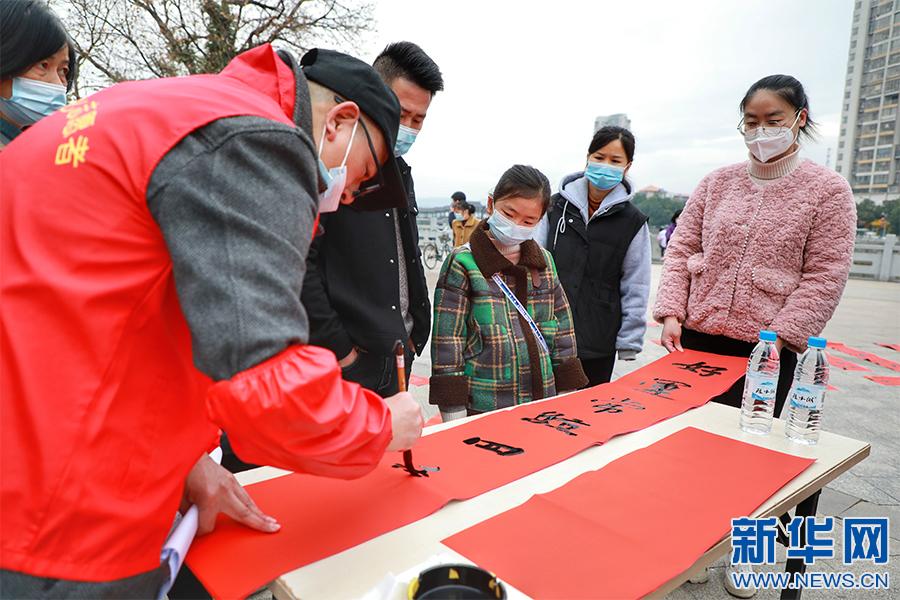 新春佳節(jié)將至,江西省贛州市全南縣組織縣書法家協(xié)會會員、書法愛好者分組深入全縣各個鄉(xiāng)鎮(zhèn)、各城市社區(qū)為群眾現(xiàn)場免費書寫春聯(lián),送上新春的美好祝福。(譚茜予 尹其奇)