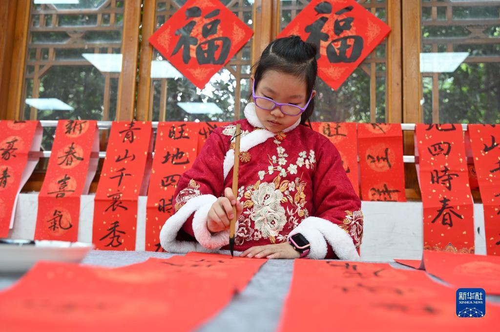 1月12日,在四川省內(nèi)江市東興區(qū)東興老街新時(shí)代文明實(shí)踐站,小學(xué)生為社區(qū)居民書寫春聯(lián)和福字。新華社發(fā)(蘭自濤攝)
