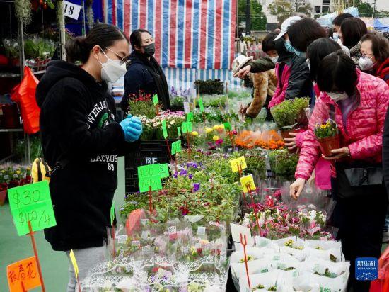 1月16日,在維多利亞公園年宵花市,顧客在花攤前挑選年花。新華社記者 褚萌萌 攝