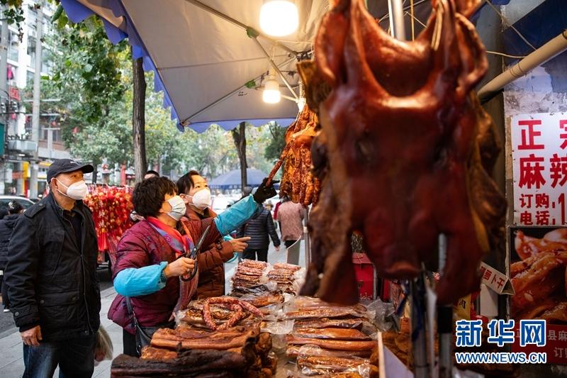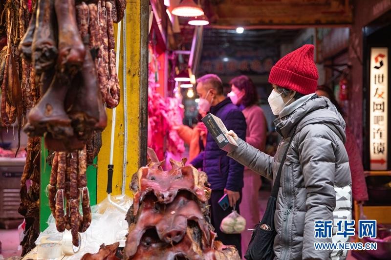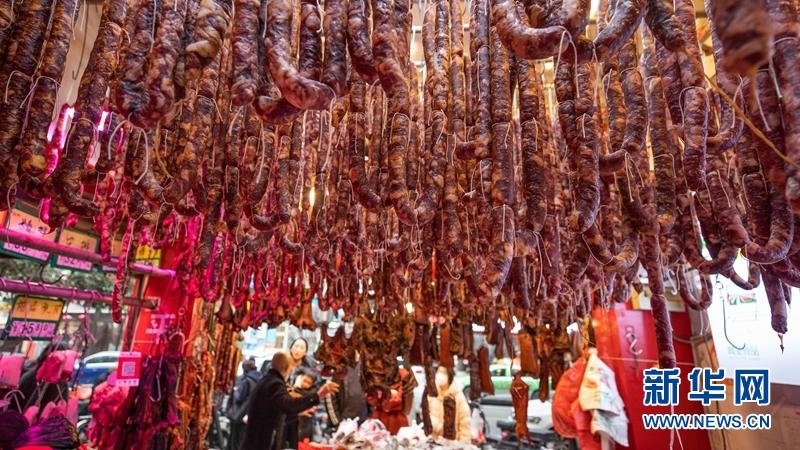 在成都市新開寺街,街道兩旁的肉鋪掛滿了香腸臘肉,市民在肉鋪前挑選香腸臘肉。