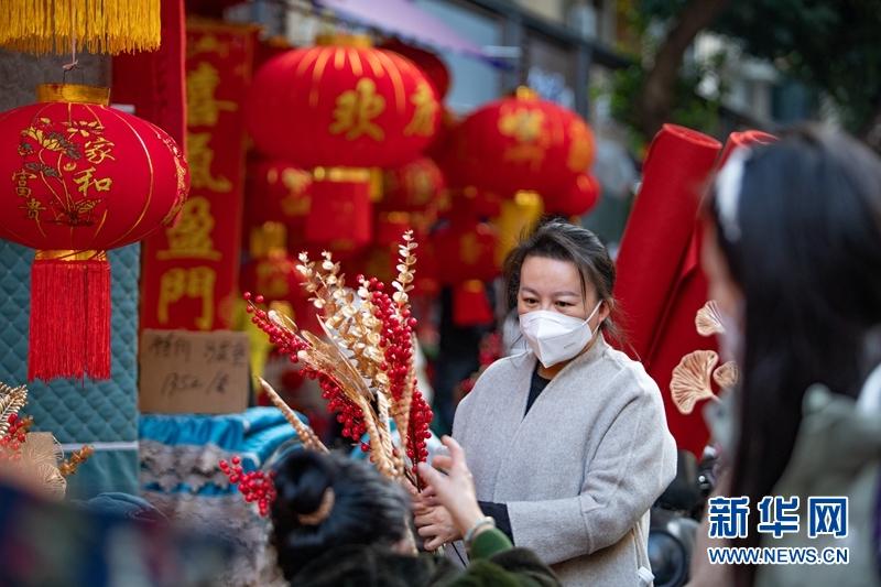 市民在成都荷花池批發(fā)市場商鋪采購春聯(lián)、“?!弊值葌鹘y(tǒng)年貨。
