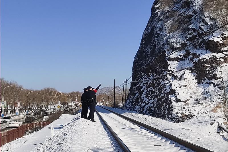 大風(fēng)天承接雨雪天,京承鐵路線上,呼嘯的寒風(fēng)吹起地面積雪,雪沫拍打在臉上冰涼刺骨。承德站派出所所長會亞君帶領(lǐng)民警來到線路的一處山體旁,“雨雪天開展線路督導(dǎo)檢查,要確保線路設(shè)備設(shè)施運轉(zhuǎn)正常,還要防止周圍山體松動,落石影響行車”,會亞君告訴記者,在雪地里踏著石渣行進很慢,一兩個小時身上就開始出汗,山風(fēng)一吹就更冷了。