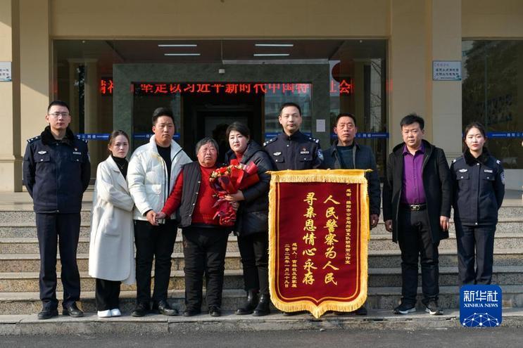 1月29日,宮女士(右五)與家人重新團(tuán)圓后向公安民警贈送錦旗。(綿陽市公安局供圖)