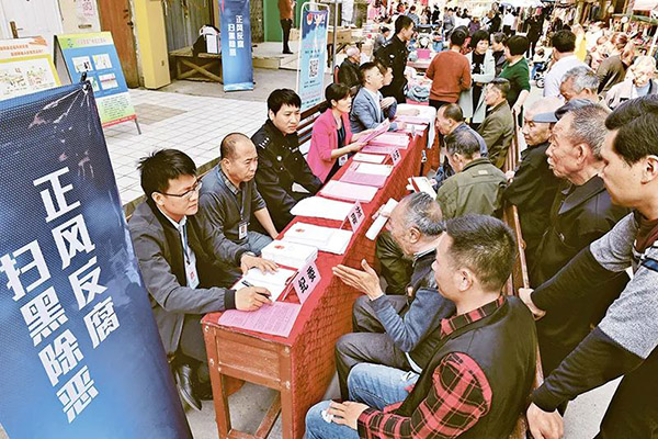 部署開展掃黑除惡專項斗爭,社會治安秩序明顯改善,基層治理成效顯著。圖為在掃黑除惡斗爭中,福建省建甌市接訪工作人員在小橋鎮(zhèn)墟日上接待群眾來訪。新華社記者張國俊/攝