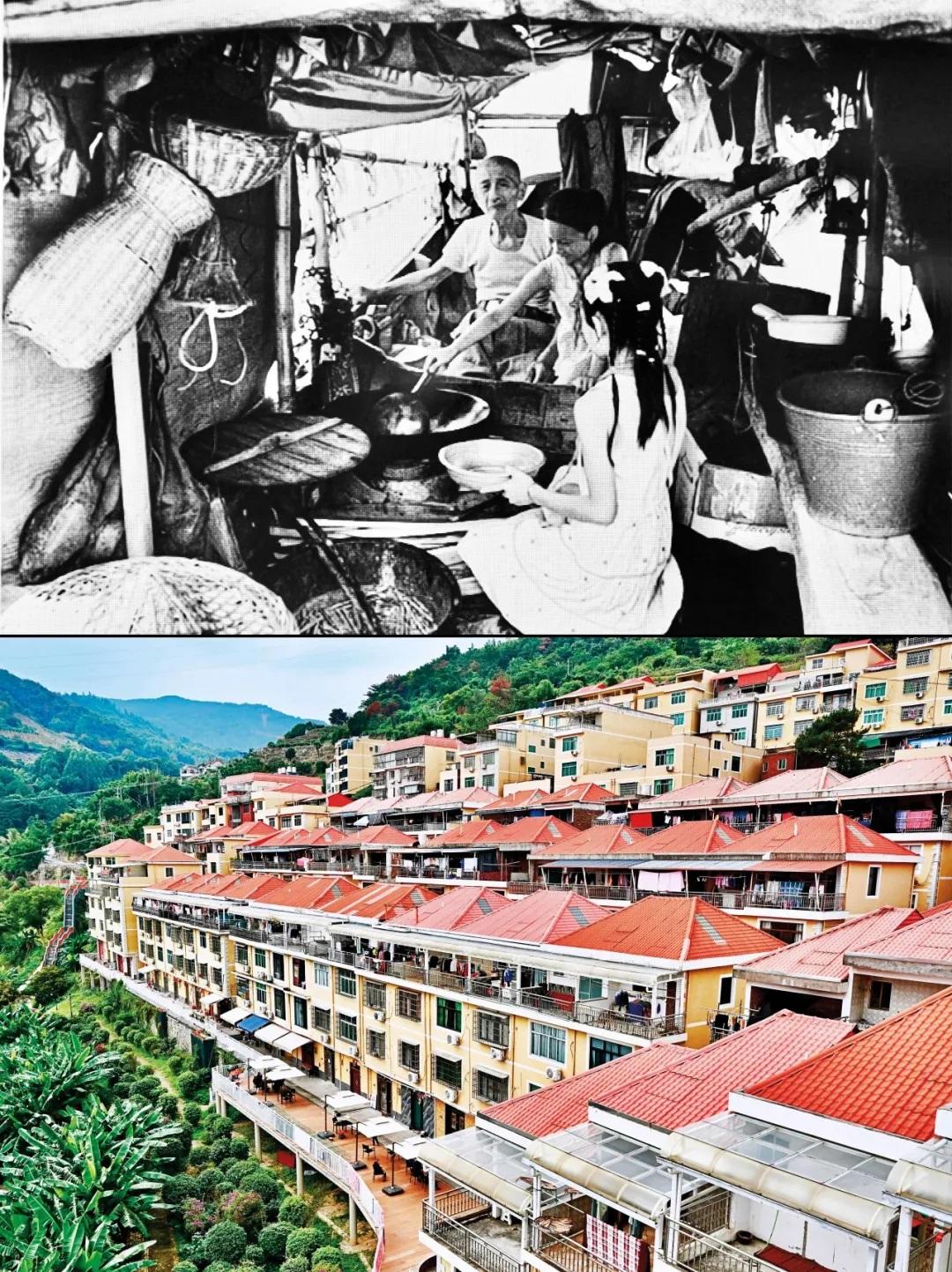 在福建省寧德市福安市下岐村,歷史上,村民祖祖輩輩以在淺海灘涂“討小?!睘樯粭l小木船就是幾代人的家,生活條件異常艱苦,被稱為“連家船民”。20世紀90年代,福建“造福工程”啟動,下岐村采取“分期分批,全面搬遷”的辦法,將2000多名漁民安置上岸。如今的下岐村,成排的小洋樓矗立,漁民廣場、白馬公園等休閑設(shè)施一應(yīng)俱全,呈現(xiàn)出一幅百姓安居樂業(yè)的現(xiàn)代鄉(xiāng)村圖景。圖為拼版照片:上圖為20世紀80年代福建寧德地區(qū)的連家船民生活場景(資料照片);下圖為2023年11月15日拍攝的下岐村(新華社記者 姜克紅/攝)。 新華社發(fā)