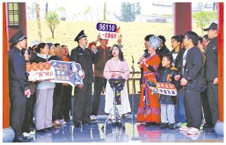圖為廣西壯族自治區(qū)玉林市陸川縣公安局民警近日來到文昌公園,與身穿民族服飾的歌手一同唱響禁毒、反詐主題山歌。 阮琬珍 攝