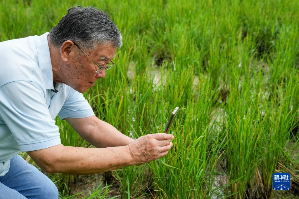 趙亞夫在江蘇省句容市天王鎮(zhèn)戴莊村查看水稻長(zhǎng)勢(shì)(2022年9月9日攝)。新華社記者 李博 攝