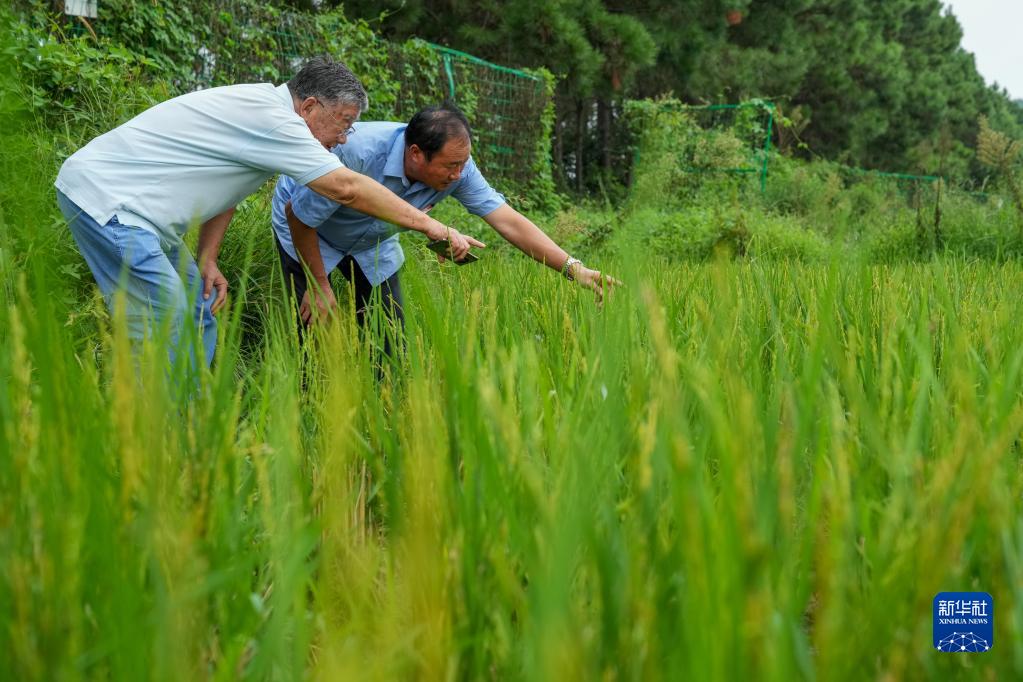 趙亞夫(左)在江蘇省句容市天王鎮(zhèn)戴莊村查看水稻長(zhǎng)勢(shì)(2022年9月9日攝)。新華社記者 李博 攝