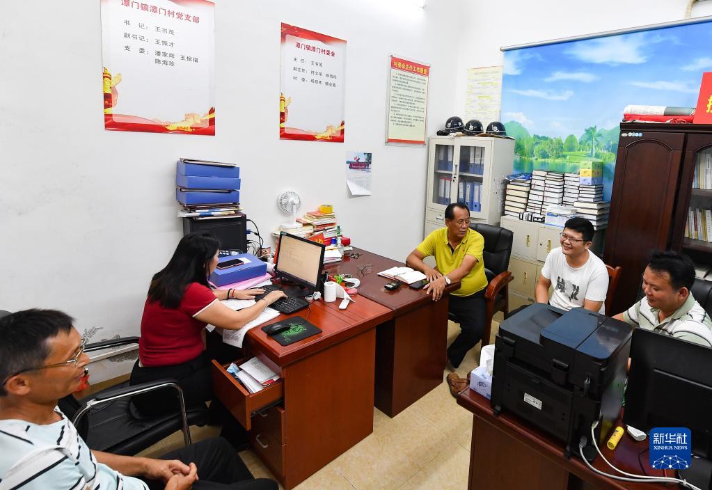 王書茂(中)在海南省瓊海市潭門鎮(zhèn)潭門村村委會辦公室同村干部討論工作(9月14日攝)。新華社記者 楊冠宇 攝