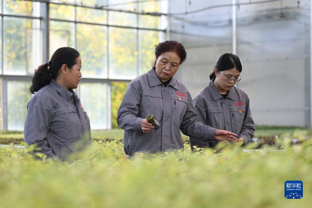 在青海省西寧市林業(yè)科學研究所的溫室內(nèi),張錦梅(中)與同事在查看種苗(9月14日攝)。新華社記者 張龍 攝
