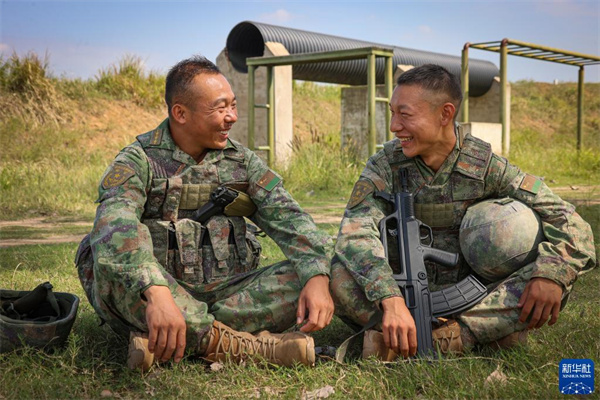 陸軍第71集團(tuán)軍某旅“濟(jì)南英雄連”連長孫金龍(左)在訓(xùn)練結(jié)束后與戰(zhàn)士談心(2022年9月22日攝)。新華社發(fā)(黃振宇 攝)
