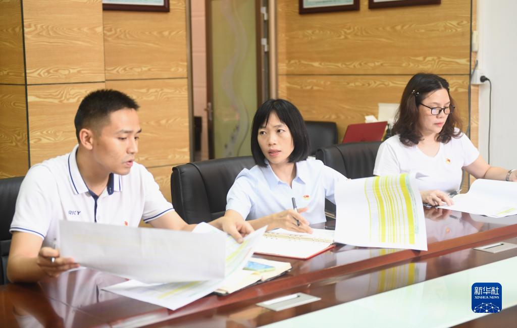 陸秀興(中)與佛山市禪城區(qū)張槎街道古灶村“兩委”班子同事開會交流(2022年9月7日攝)。新華社記者 盧漢欣 攝