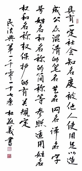 民法典第一千零一十七條 具有一定社會(huì)知名度,被他人使用足以造成公眾混淆的筆名、藝名、網(wǎng)名、譯名、字號、姓名和名稱的簡稱等,參照適用姓名權(quán)和名稱權(quán)保護(hù)的有關(guān)規(guī)定。