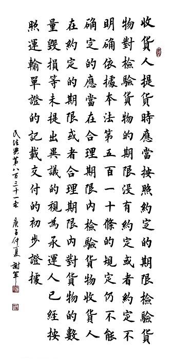 民法典第八百三十一條 收貨人提貨時應(yīng)當(dāng)按照約定的期限檢驗(yàn)貨物。對檢驗(yàn)貨物的期限沒有約定或者約定不明確,依據(jù)本法第五百一十條的規(guī)定仍不能確定的,應(yīng)當(dāng)在合理期限內(nèi)檢驗(yàn)貨物。收貨人在約定的期限或者合理期限內(nèi)對貨物的數(shù)量、毀損等未提出異議的,視為承運(yùn)人已經(jīng)按照運(yùn)輸單證的記載交付的初步證據(jù)。