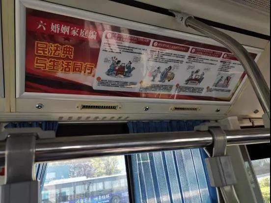 在宣傳《民法典》公交車車體內(nèi)外,精心營造學習宣傳《民法典》的濃厚氛圍,將《民法典》公交專線主題設計為“《民法典》與生活同行”,車體以紅色為主基調(diào),圖文并茂,視覺沖擊力強。車內(nèi)兩側、坐椅靠背、車廂展板等位置進行了全方位包裝,車內(nèi)移動電視持續(xù)播放《民法典》宣傳短視頻,展示《民法典》中見義勇為免責、小區(qū)共有場地收入歸業(yè)主、夫妻共同債務如何界定等與百姓生活息息相關的法條。乘客在乘車的同時,可以感受到學習《民法典》的樂趣和必要性。