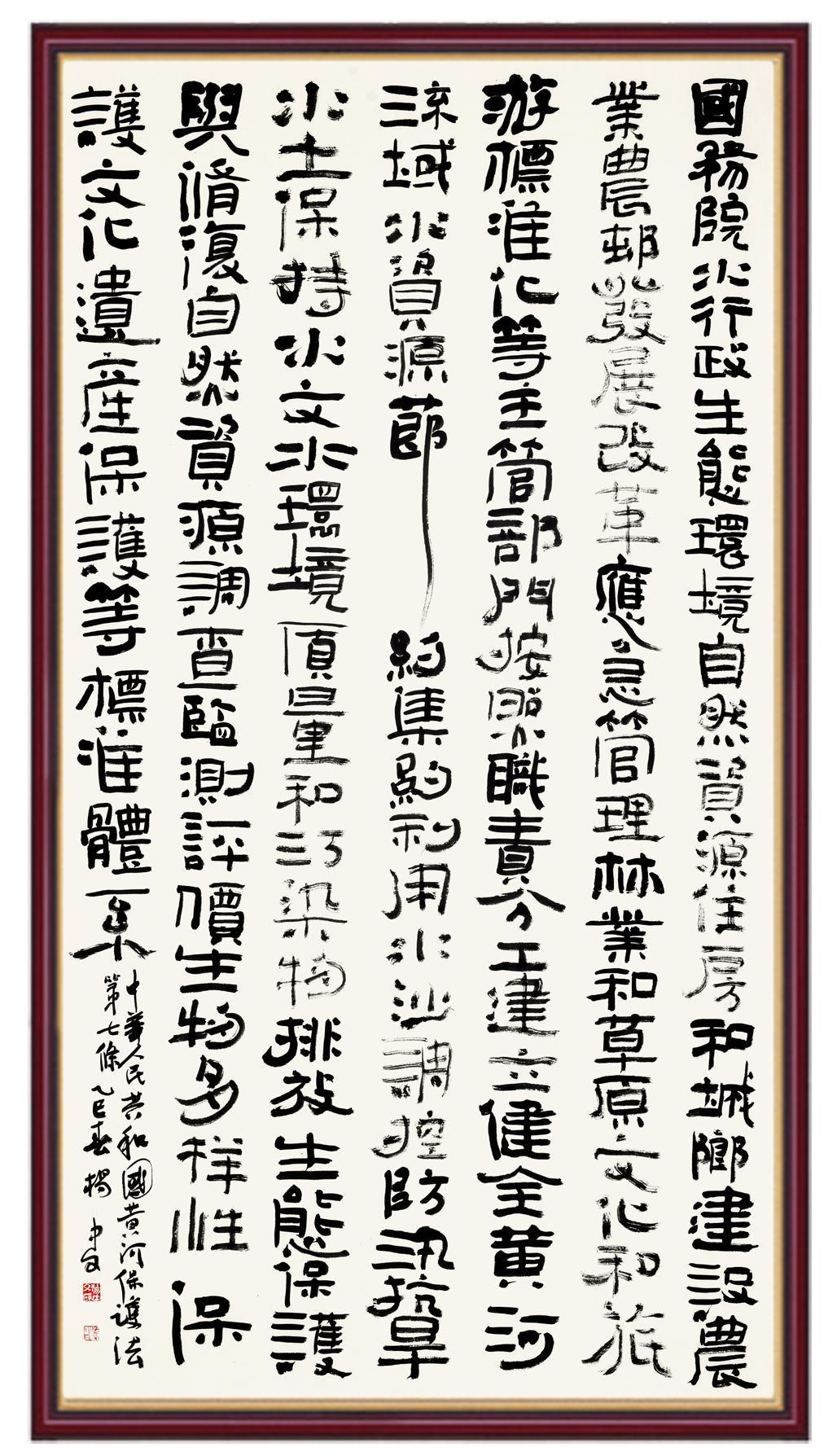 黃河寧,天下平。黃河是中華民族的發(fā)源地和搖籃,保護黃河是事關(guān)中華民族偉大復興的千秋大計?!吨腥A人民共和國黃河保護法》為推進水資源節(jié)約集約利用、保護傳承弘揚黃河文化、推動黃河流域生態(tài)保護和高質(zhì)量發(fā)展提供了有力法治保障。繼書寫《中華人民共和國民法典》《中華人民共和國憲法》《中華人民共和國澳門特別行政區(qū)基本法》《中華人民共和國香港特別行政區(qū)基本法》《中華人民共和國國旗法》《中華人民共和國國徽法》《中華人民共和國國歌法》《中華人民共和國法官法》等法律法規(guī)之后,法制日報社聯(lián)合沿黃九?。▍^(qū))司法廳、書法家協(xié)會,將筆端對準《中華人民共和國黃河保護法》。