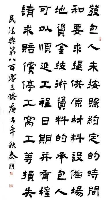 書法作品獲“農(nóng)行杯”首屆中國電視書法大賽一等獎等。出版《秦朋隸書<論語>書法作品集》等。