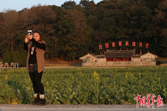2014年2月24日,位于福建省上杭縣的古田會議會址前,一位女青年拍照留念。中青報(bào)·中青網(wǎng)記者 李建泉/攝