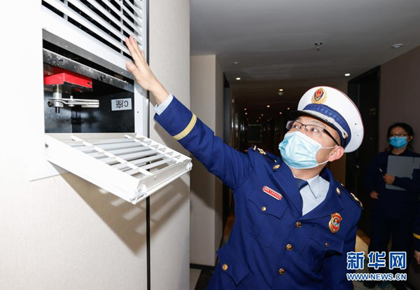 2月1日,消防監(jiān)督檢查人員在商務(wù)酒店內(nèi)現(xiàn)場測試排煙口風(fēng)量。
