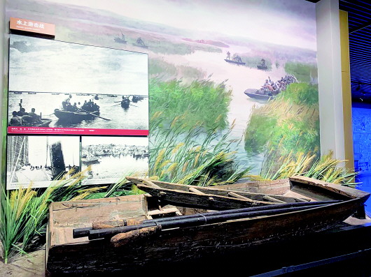 跟隨任京培的步伐,記者看到了紀(jì)念館中陳列的一艘長(zhǎng)約三四米的木船,上面被日軍射擊的累累彈痕印證著歷史。在船上,還有兩把近3米的大抬杠槍。任京培說(shuō),這是一種當(dāng)?shù)孬C人發(fā)明的武器,槍筒又長(zhǎng)又粗,不但打得遠(yuǎn),而且火力足威力大。