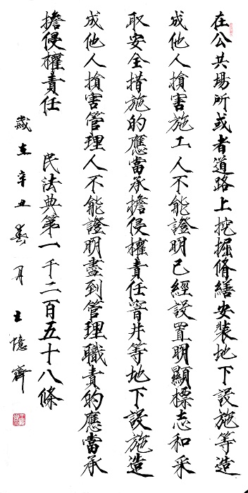 民法典第一千二百五十八條 在公共場(chǎng)所或者道路上挖掘、修繕安裝地下設(shè)施等造成他人損害,施工人不能證明已經(jīng)設(shè)置明顯標(biāo)志和采取安全措施的,應(yīng)當(dāng)承擔(dān)侵權(quán)責(zé)任。