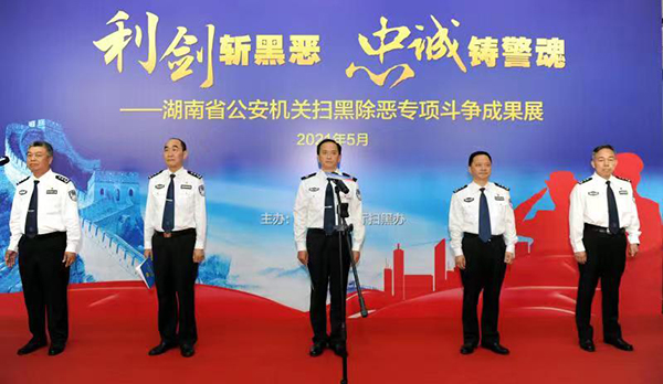 5月27日上午,湖南省公安廳隆重舉辦“利劍斬黑惡、忠誠(chéng)鑄警魂”掃黑除惡專項(xiàng)斗爭(zhēng)成果展。成果展分高位謀劃、組織推動(dòng)、大案攻堅(jiān)、專項(xiàng)打擊、隊(duì)伍建設(shè)、工作成效六個(gè)方面,展示了全省公安機(jī)關(guān)掃黑除惡專項(xiàng)斗爭(zhēng)的輝煌戰(zhàn)果,再現(xiàn)了全省廣大公安民警堅(jiān)決圍剿黑惡勢(shì)力、徹底鏟除其滋生土壤的戰(zhàn)斗歷程。副省長(zhǎng)、公安廳長(zhǎng)許顯輝出席開幕式并致辭。