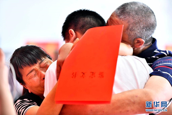 6月8日,在“認(rèn)親,我們在行動”濟(jì)南主會場,張某(左)和吳某林(右)擁抱著被拐的兒子。新華社記者 郭緒雷 攝
