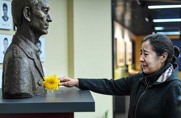 2021年4月3日,在新疆警史館,瑪依努爾在愛人艾熱提的雕像前擺上菊花。新華社記者 王菲 攝