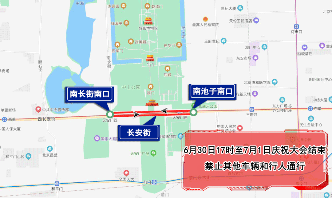 6月30日17時(shí)至7月1日慶祝大會(huì)結(jié)束,長(zhǎng)安街由南長(zhǎng)街南口(不含)至南池子南口(不含)雙方向路段,除持有慶祝大會(huì)專用證件的車輛和人員外,禁止其他車輛和行人通行。