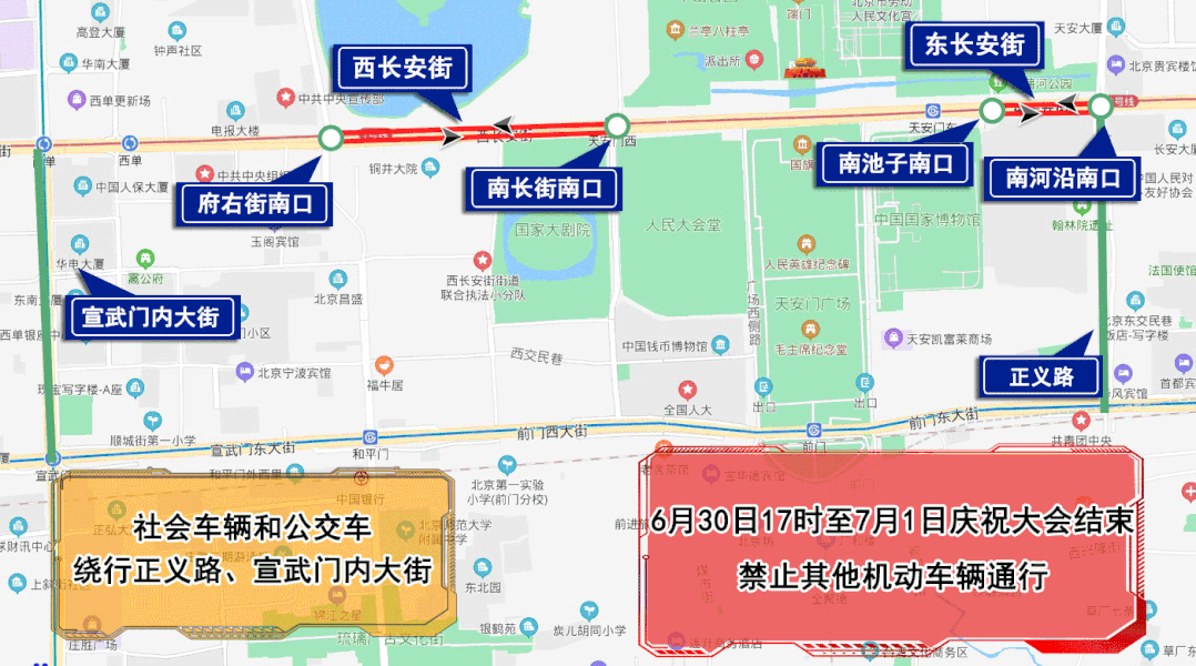6月30日17時(shí)至7月1日慶祝大會(huì)結(jié)束,西長(zhǎng)安街由府右街南口(不含)至南長(zhǎng)街南口(不含)、東長(zhǎng)安街由南河沿南口(不含)至南池子南口(不含)雙方向路段,除持有慶祝大會(huì)專用證件的車輛外,禁止其他機(jī)動(dòng)車輛通行。社會(huì)車輛和公交車經(jīng)正義路、宣武門內(nèi)大街繞行。