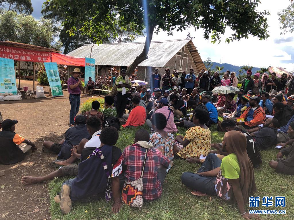 2020年12月15日,林應(yīng)興(戴草帽者)在巴布亞新幾內(nèi)亞東高地省中國援助巴新菌草和旱稻技術(shù)項(xiàng)目第9期培訓(xùn)班上授課。新華社發(fā)