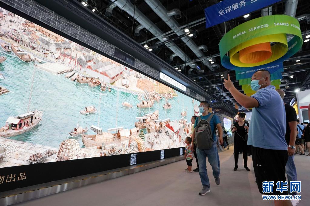 在2020年中國國際服務(wù)貿(mào)易交易會綜合展區(qū),參觀者在參觀展出的《穿越時(shí)空的大運(yùn)河》數(shù)字影像(2020年9月6日攝)。新華社記者 鞠煥宗 攝
