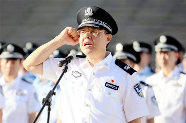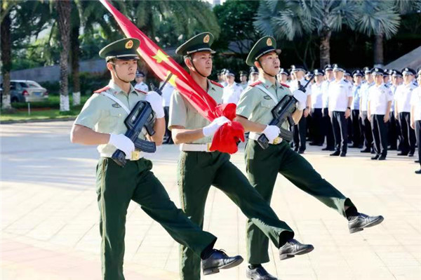“我宣誓,我志愿加入中國共產(chǎn)黨,擁護黨的綱領(lǐng),遵守黨的章程,履行黨員義務(wù)……”升旗儀式結(jié)束后,閆希軍帶領(lǐng)全體人員列陣而立,緊握高舉的右拳,重溫了入黨誓詞。隨后,全體人員共同演唱了《沒有共產(chǎn)黨就沒有新中國》《中國人民警察警歌》,鏗鏘有力的歌聲響徹現(xiàn)場,把歌聲獻給黨,彰顯了海南公安機關(guān)廣大公安民警輔警向黨和人民獻禮的決心和信心。